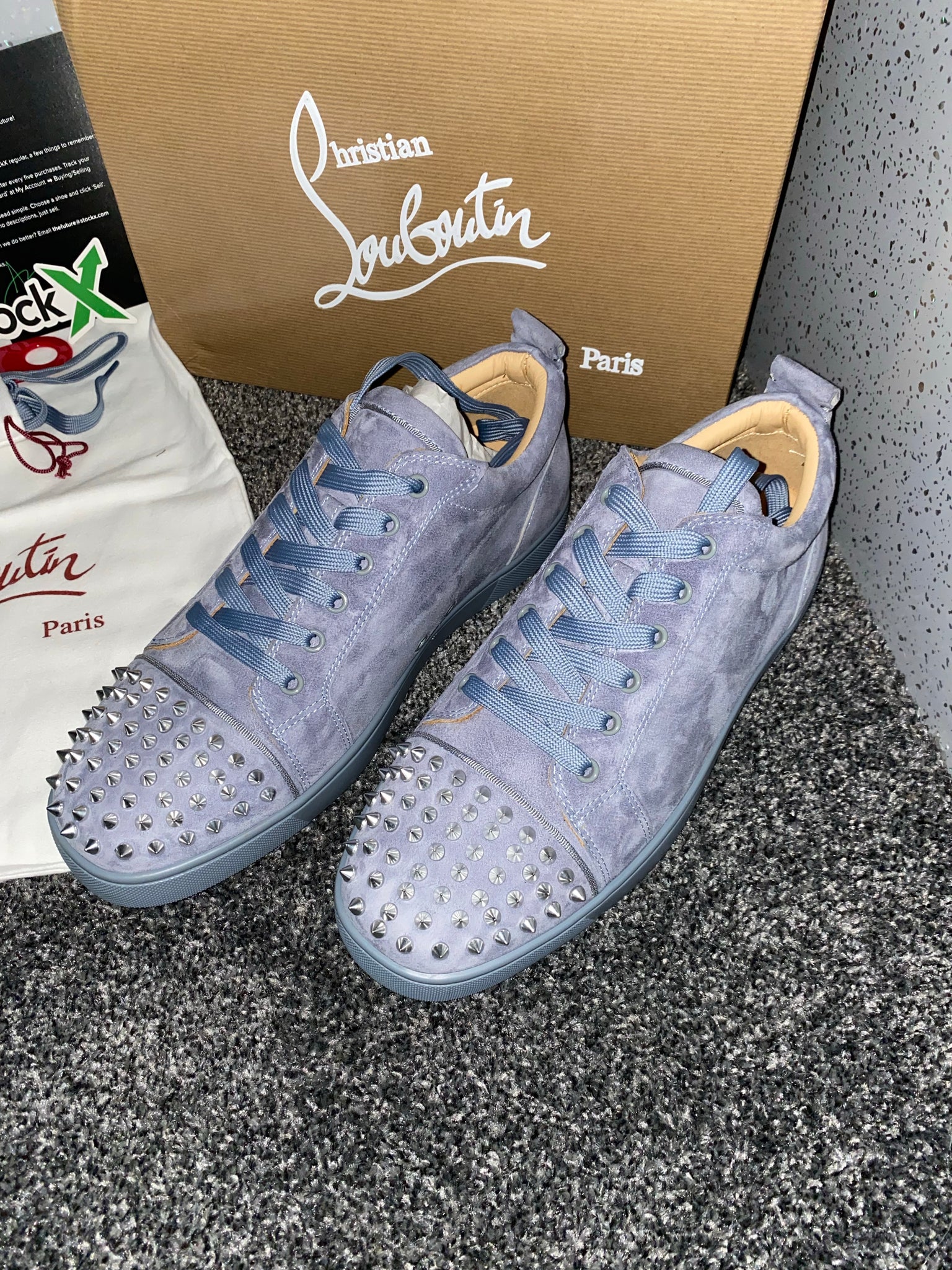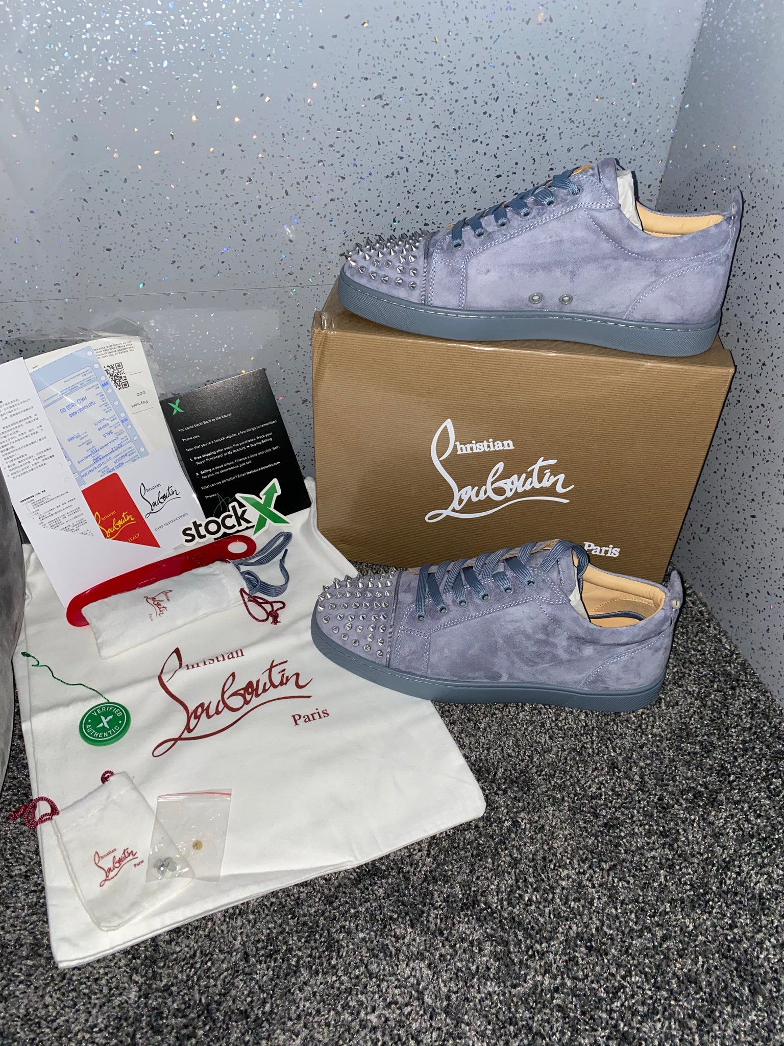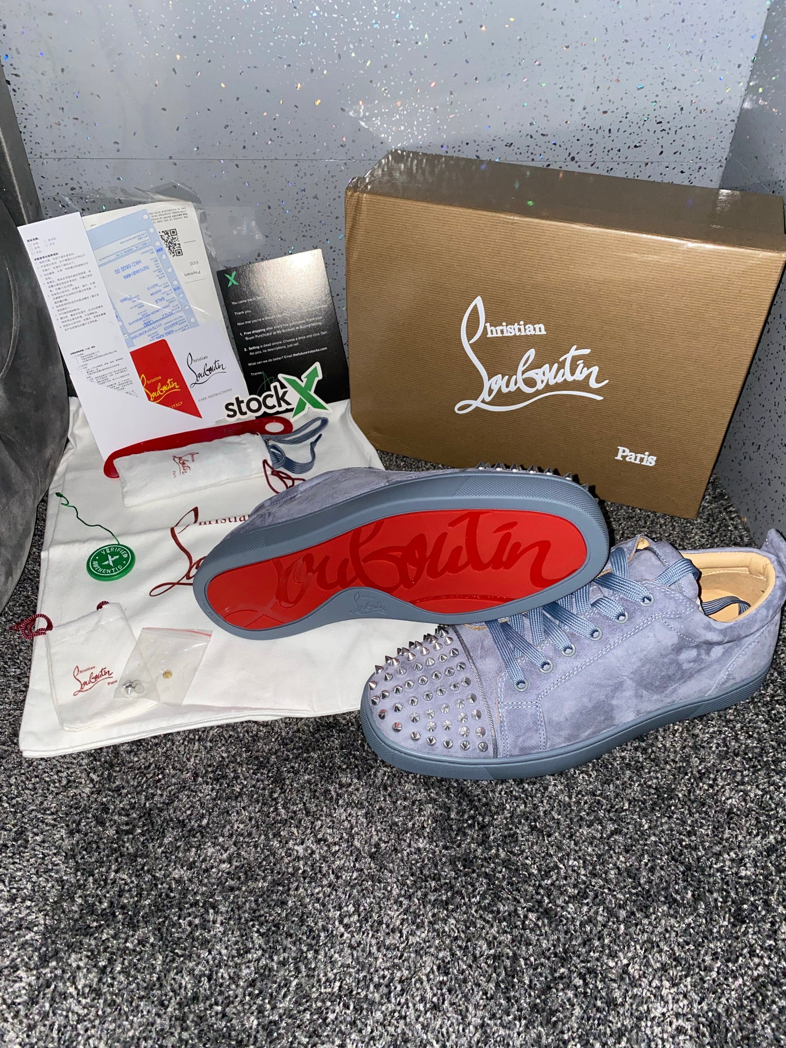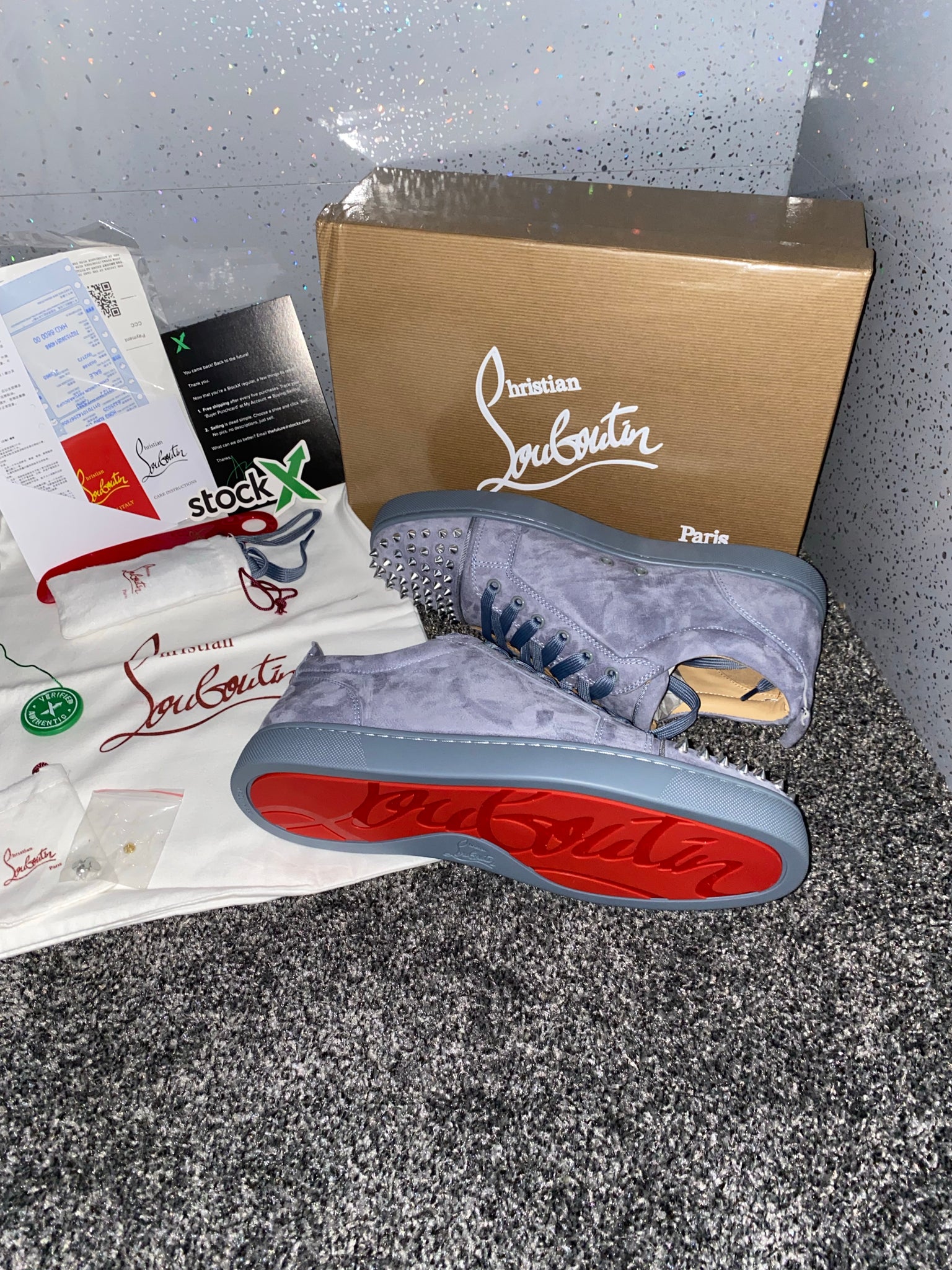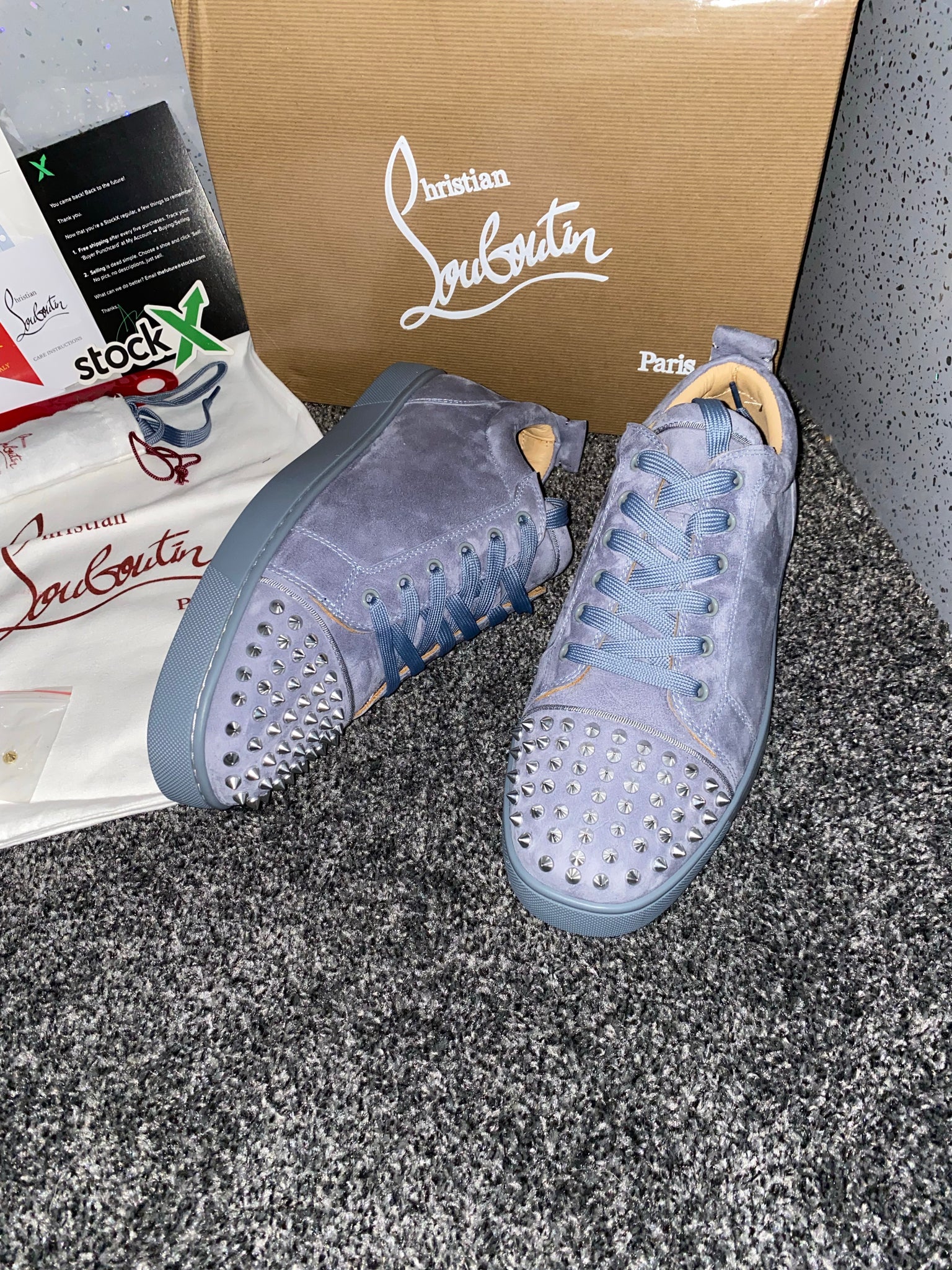 They come with a box, dust bag and papers. They are true to size so there is no need to get a different size.